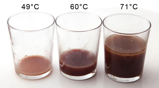 Температура имеет большое влияние на сочность и текстуру стейка. Иллюстрация показывает, сколько сока выходит из трех идентичных стейков, но приготовленных с различными температурами: