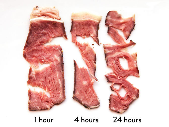 Чтобы выяснить, что именно происходит, когда вы готовите стейк Су-Вид в течение длительного периода, были приготовлены одинаковые стейки при температуре 54°C с интервалами от 1 часа вплоть до 48 часов. Обнаружено, что наиболее важные различия, как правило, происходят между четырмя и 24-мя часовыми интервалами.